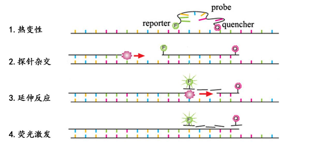 Taqman探針法:5末端連接熒光基團,3端末端連接猝滅基團,PCR擴增時,兩個基團相互分離,熒光基團得以檢測。