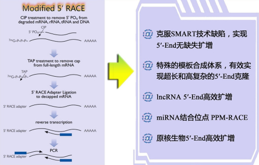 (1) 修飾的5’-RACE技術(shù):在經(jīng)典5’-RACE基礎(chǔ)上,進行了諸多改進,如加入增強劑,選取耐高溫、高效逆轉(zhuǎn)錄酶,以及縮短每步RNA沉淀過程,減少RNA降解等方式,有效實現(xiàn)了超長、特殊結(jié)構(gòu)5’-RACE片段的獲?。?/span>