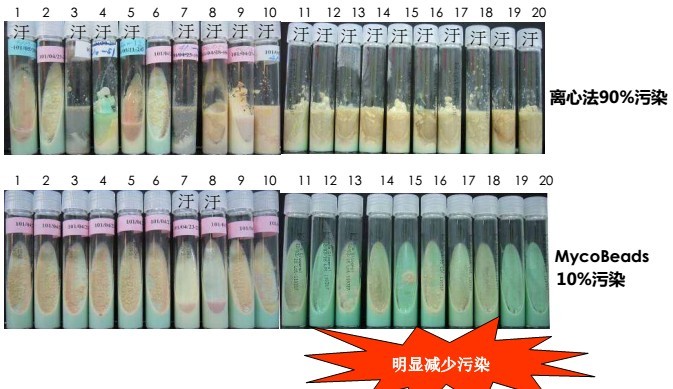 2.MycoBeads分離后的結(jié)核分枝桿菌經(jīng)培養(yǎng)具有更少的污染--與離心法分離法進行比較