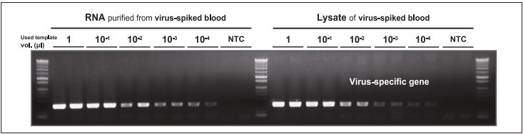 圖4.HelixAmp 直接RT-PCR試劑盒與傳統(tǒng)RT-PCR試劑盒檢測侵染全血中動物RNA病毒的靈敏度比較。圖中所示Used template