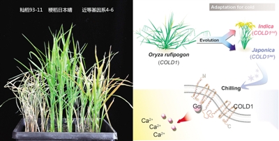 水稻起源于熱帶和亞熱帶,對(duì)環(huán)境低溫非常敏感,限制了其種植區(qū)域。人工馴化選擇使粳稻種植能延伸到低積溫帶區(qū)域。近年來(lái)全球氣候變化導(dǎo)致的異常氣溫頻發(fā),直接威脅水稻的生產(chǎn),而植物感知低溫機(jī)理知之甚少。中國(guó)科學(xué)院植物研究所種康研究組與中國(guó)水稻所錢(qián)前研究員等合作發(fā)現(xiàn)水稻感受低溫的數(shù)量性狀位點(diǎn)基因COLD1賦予了粳稻的耐寒性。該基因編碼一個(gè)九次跨膜的G-蛋白信號(hào)調(diào)節(jié)因子,定位于質(zhì)膜和內(nèi)質(zhì)網(wǎng)。遇冷時(shí)COLD1與G-蛋白α亞基RGA1互作,激活Ca2+通道、觸發(fā)下游耐寒防御反應(yīng);COLD1jap基因起源于中國(guó)野生稻而賦予粳稻耐寒性。這是國(guó)際上首次報(bào)道的植物低溫感受器,揭示了人工馴化賦予粳稻耐寒性的分子細(xì)胞學(xué)機(jī)制。該成果對(duì)于水稻耐寒性的分子設(shè)計(jì)改良有重要的指導(dǎo)意義和潛在的應(yīng)用前景。本研究成果在2015年7月《Cell》雜志上以封面論文發(fā)表。