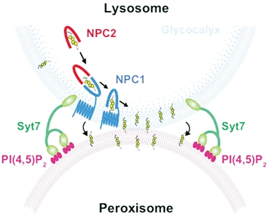 膽固醇是細(xì)胞不可或缺的脂類(lèi)物質(zhì),其代謝異常會(huì)引起動(dòng)脈粥樣硬化和神經(jīng)系統(tǒng)病變。細(xì)胞內(nèi)膽固醇運(yùn)輸?shù)臋C(jī)制并不清楚。武漢大學(xué)宋保亮團(tuán)隊(duì)研究發(fā)現(xiàn),過(guò)氧化物酶體與溶酶體之間可產(chǎn)生動(dòng)態(tài)接觸,該過(guò)程由溶酶體上的SytVII蛋白結(jié)合到過(guò)氧化物酶體上的脂質(zhì)分子PI(4,5)P2來(lái)介導(dǎo)。膽固醇正是通過(guò)這一新型的細(xì)胞器的膜接觸,由溶酶體運(yùn)輸至過(guò)氧化物酶體。許多過(guò)氧化物酶體基因突變會(huì)導(dǎo)致發(fā)育和神經(jīng)系統(tǒng)功能障礙,該工作第一次揭示了膽固醇堆積是過(guò)氧化物酶體紊亂疾病的發(fā)病原因之一。這項(xiàng)研究不僅發(fā)現(xiàn)了細(xì)胞內(nèi)膽固醇運(yùn)輸?shù)男聶C(jī)制,揭示了過(guò)氧化物酶體細(xì)胞器的新功能,更重要的是為治療膽固醇代謝異常相關(guān)疾病提供了新的線(xiàn)索和思路。研究成果在2015年4月《Cell》上發(fā)表,同期配發(fā)了評(píng)述文章。