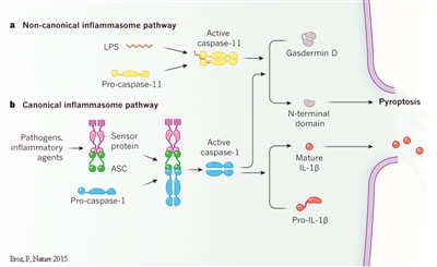 細(xì)胞炎性壞死(細(xì)胞焦亡,pyroptosis)是機(jī)體的重要免疫防御反應(yīng),在清除病原感染和內(nèi)源危險(xiǎn)信號(hào)中均發(fā)揮重要作用。細(xì)胞焦亡由炎性蛋白酶caspase(caspase-1和caspase-4/5/11)介導(dǎo),但具體機(jī)制完全不清楚。北京生命科學(xué)研究所邵峰團(tuán)隊(duì)和廈門(mén)大學(xué)韓家淮團(tuán)隊(duì)分別獨(dú)立鑒定出全新的GSDMD蛋白,并證明GSDMD是所有炎性caspase的共有底物,其切割對(duì)于caspase激活細(xì)胞焦亡既是必要的也是充分的。這些工作揭示細(xì)胞焦亡的關(guān)鍵分子機(jī)制,為多種自身炎癥性疾病和內(nèi)毒素誘導(dǎo)的敗血癥提供了全新的藥物靶點(diǎn)。邵峰和韓家淮論文分布在《Nature》(2015年10月)和《Cell Research》(2015年12月)上發(fā)表。