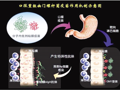 幽門(mén)螺桿菌(Hp)是慢性胃炎、胃及十二指腸潰瘍的致病菌,是胃癌的主要致病因子。我國(guó)胃病患者超過(guò)1億,每年因胃癌死亡者達(dá)20萬(wàn)人。第三軍醫(yī)大學(xué)鄒全明、中國(guó)食品藥品檢定研究院曾明和江蘇省疾病預(yù)防控制中心朱鳳才三位教授聯(lián)合研究,發(fā)明了“Hp分子內(nèi)佐劑粘膜疫苗”設(shè)計(jì)原理和安全高效的首個(gè)人用分子內(nèi)粘膜免疫佐劑;設(shè)計(jì)與制造出全新的Hp疫苗組份;研究出國(guó)際上首個(gè)Hp疫苗生產(chǎn)與檢定質(zhì)量標(biāo)準(zhǔn)。歷時(shí)15年,完成了Hp疫苗5000余人參加的臨床試驗(yàn),成功研發(fā)了具有完全自主知識(shí)產(chǎn)權(quán)的世界首個(gè)Hp疫苗,并安全、有效,保護(hù)率達(dá)71.8%,獲國(guó)家1.1 類(lèi)新藥證書(shū)。