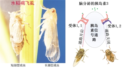昆蟲(chóng)長(zhǎng)、短翅可變發(fā)育是生物發(fā)育可塑性的典型例子,是昆蟲(chóng)進(jìn)化成功的重要特性。稻飛虱是水稻的最重要害蟲(chóng),若蟲(chóng)可以根據(jù)環(huán)境條件變化,選擇性地發(fā)育為能飛行的長(zhǎng)翅型成蟲(chóng),或發(fā)育為不能飛行但繁殖更強(qiáng)的短翅型,這種可塑性發(fā)育是該蟲(chóng)成為毀滅性大害蟲(chóng)的重要原因。浙江大學(xué)張傳溪教授帶領(lǐng)的團(tuán)隊(duì)研究發(fā)現(xiàn),稻飛虱翅芽的兩個(gè)胰島素受體在長(zhǎng)、短翅分化中作用相反,起著分子“開(kāi)關(guān)”作用。抑制胰島素受體I基因和胰島素通路會(huì)導(dǎo)致轉(zhuǎn)錄因子FOXO進(jìn)入細(xì)胞核,若蟲(chóng)就發(fā)育為短翅型成蟲(chóng);而抑制在翅芽組織中特異表達(dá)的胰島素受體II基因就會(huì)導(dǎo)致FOXO滯留于翅芽的細(xì)胞質(zhì),若蟲(chóng)就發(fā)育為長(zhǎng)翅型成蟲(chóng)。本研究成果在2015年3月《Nature》雜志上發(fā)表,被認(rèn)為“是多型現(xiàn)象分子機(jī)理研究的一個(gè)里程碑”,在稻飛虱防治上具有重要價(jià)值。