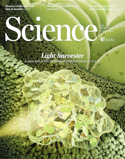光系統(tǒng)I(PSI)光合膜蛋白超分子復(fù)合物是光合作用中高效吸能、傳能和轉(zhuǎn)能的系統(tǒng),其量子轉(zhuǎn)化效率幾乎為100%。中國(guó)科學(xué)院植物研究所匡廷云、沈建仁研究團(tuán)隊(duì)在原子水平分辨率的高等植物光系統(tǒng)I-捕光天線(xiàn)(PSI-LHCI)晶體結(jié)構(gòu),解析了高等植物PSI-LHCI的精細(xì)結(jié)構(gòu),其中包括16個(gè)蛋白亞基和205個(gè)輔因子,總分子量約600kDa;揭示光系統(tǒng)I的4個(gè)捕光色素蛋白復(fù)合體(Lhca1-4)在天然狀態(tài)下的結(jié)構(gòu)及相互關(guān)系,LHCI全新的色素網(wǎng)絡(luò)系統(tǒng)和LHCI紅葉綠素的結(jié)構(gòu),明確提出LHCI向核心能量傳遞可能的4條途徑。該研究成果對(duì)于闡明光合作用機(jī)理及提高作物光能利用效率和開(kāi)辟太陽(yáng)能利用的新途徑都具有重要的理論和實(shí)踐意義。該研究成果在2015年5月《Science》期刊以長(zhǎng)文的形式并作為封面文章發(fā)表。