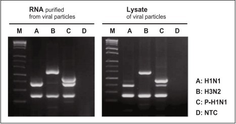 圖2.HelixAmp 直接RT-PCR試劑盒與傳統(tǒng)RT-PCR試劑盒多重檢測豬流感病毒效果比較。
