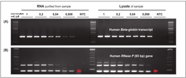指用于直接RT-PCR或用于純化DNA的全血量(純化的RNA全部用于傳統(tǒng)RT-PCR),NTC:陰性對照。