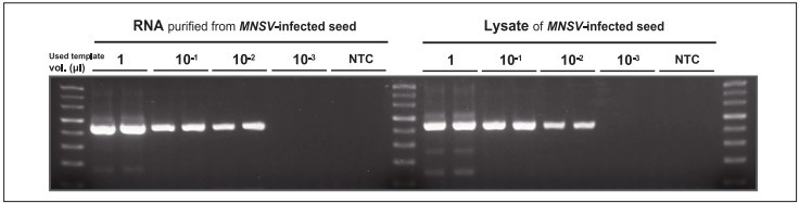 圖5.HelixAmp 直接RT-PCR試劑盒與傳統(tǒng)RT-PCR試劑盒檢測病毒侵染植物種子中瓜壞死斑病毒(MBSV)的靈敏度比較。圖中所示